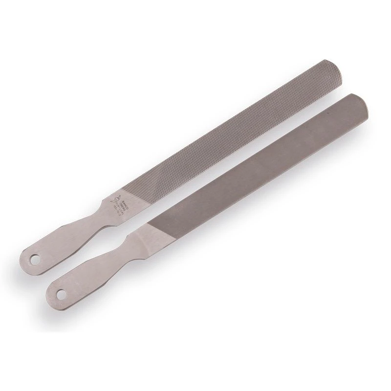 Tweezijdige landbouwvijl, zonder hecht, met verschillende grofte. Voor het vijlen van vlakke oppervlakken en het ruw scherpen en scherpen van spaden, schoffels, maaierbladen, enz. Met geïntegreerde hecht met ophanggat.