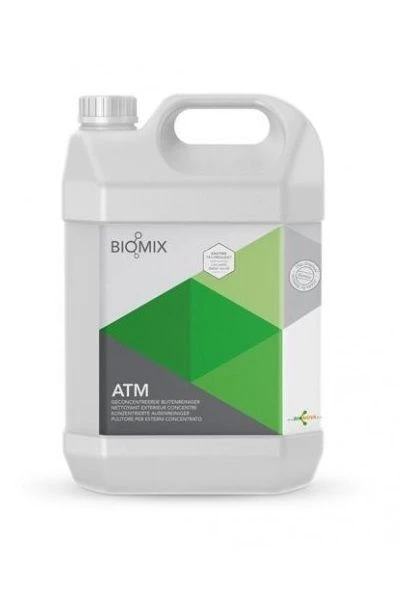 Biomix-ATM is een vloeibaar reinigingsmiddel op basis van enzymen voor het grondig reinigen van verscheidene oppervlakken buitenshuis o.a uw terras, natuursteenrieten daken enz. De speciaal geselecteerde enzymen in het product breken de vervuiling af zoals de enzymen in ons lichaam het voedsel helpen verteren. Een regenbui spoelt het afgebroken vuil voor u weg en activeert de enzymen opnieuw voor een lange nawerking.