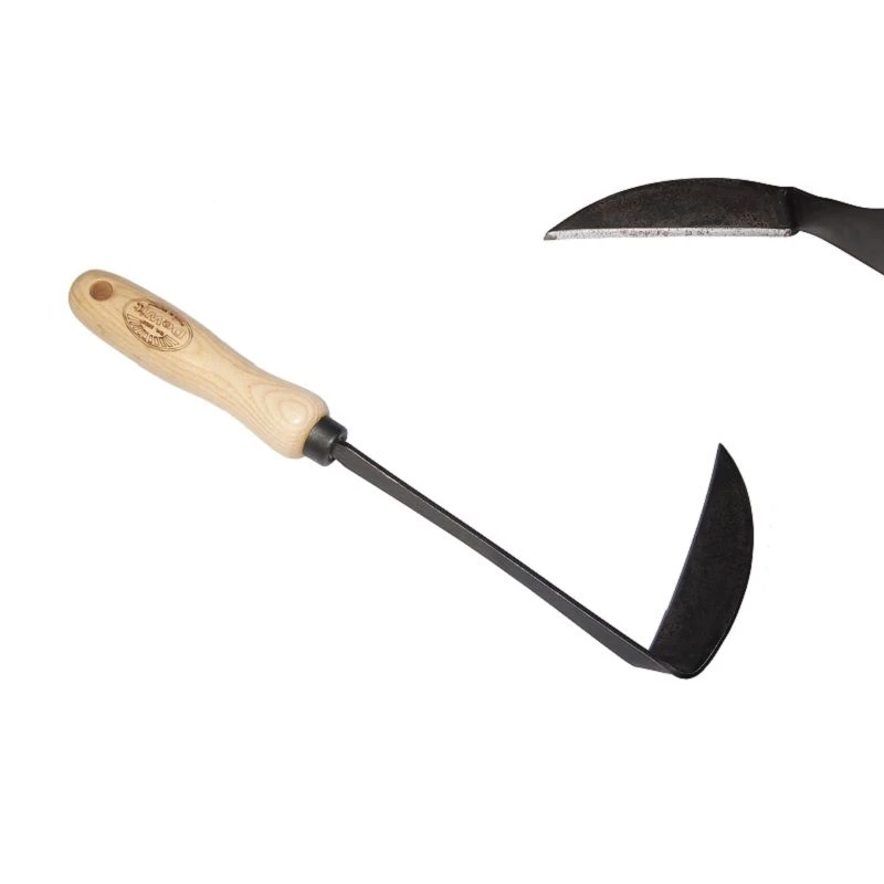 Een rechtshandige Japanse handhak. Het blad is van platgesmeed staal en aan één zijde zit een snijkant dat te gebruiken is om onkruid te wieden en schrapen. Het wordt ook wel gebruikt om gras te snijden.