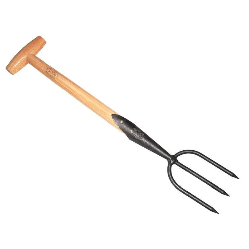 Een handgemaakt plantgreepje met 3 tanden, gesmeed uit zuiver gehard staal. Deze plantgreep wordt gebruikt om planten uit de grond te halen of om mee te verpoten. Met een essen T-steel, voorzien van een hilt om kleine handgereedschappen met twee handen te gebruiken