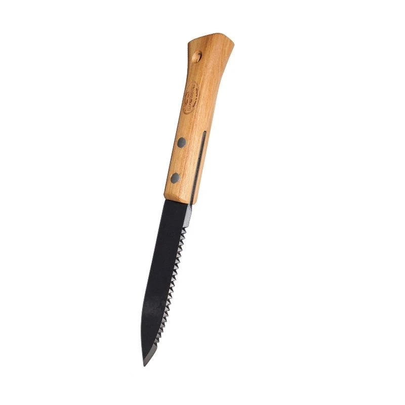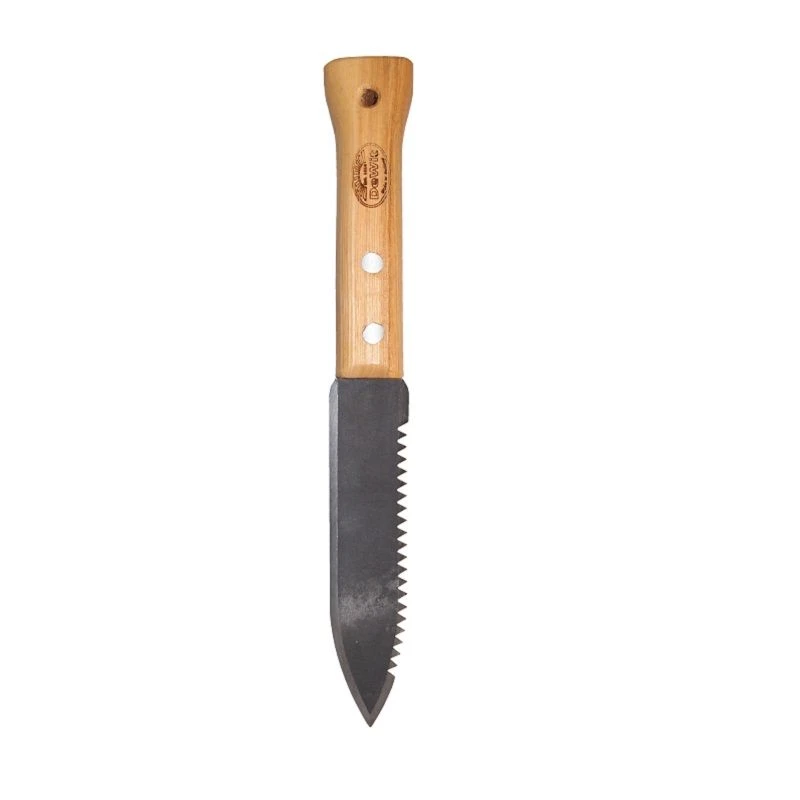 Een Tuinmes / Plantmes met aan één zijde een kartelrand waarmee gemakkelijk planten gesneden kunnen worden. Het is een erg stevig mes,voorzien van een essenhouten handvat.