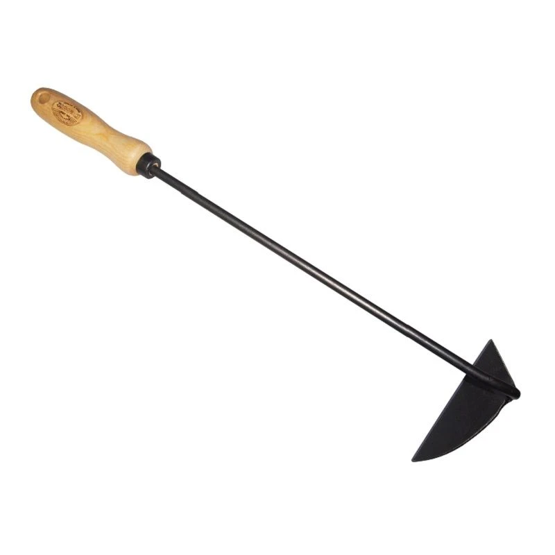 Een linkshandige schrepel, gesmeed met handvat. Gereedschap voor het wieden in zowel de border als in de moestuin.