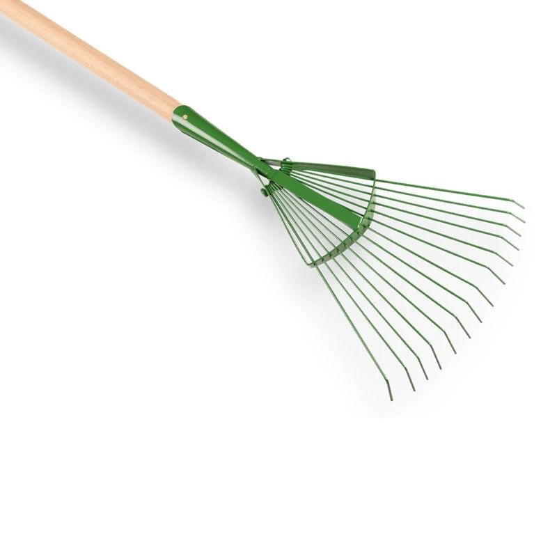 Een professionele bladhark met 14 ronde verenstalen tanden. De buitenste tanden hebben een dikte van 3 mm, voor extra stabiliteit. Deze bladhark is uitermate geschikt voor het bijeen brengen van gras, bladeren en voor los materiaal in gazon of border en om een viltlaag uit het gazon te verwijderen. Deze Farmer bladhark wordt veelvuldig gebruikt in de hovenierssector.