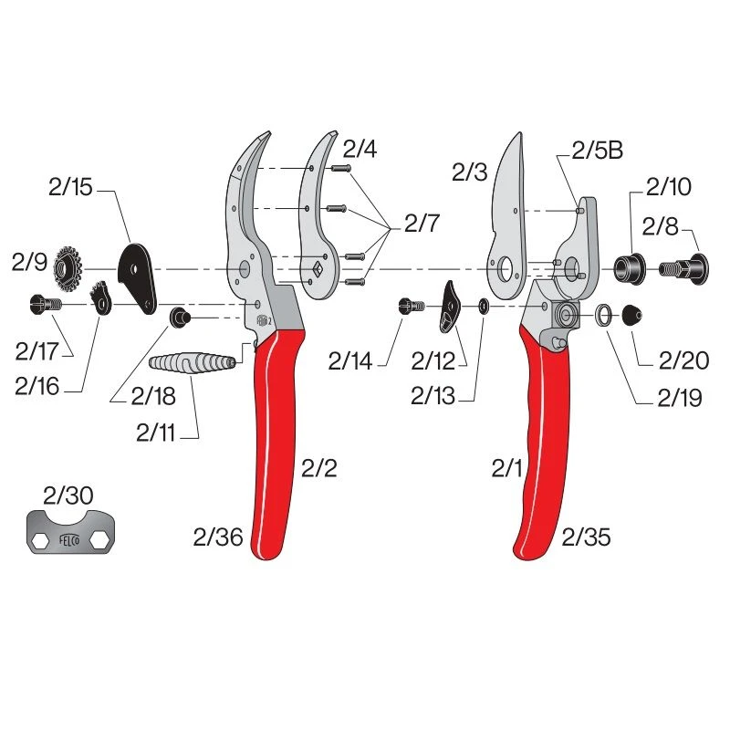 Snoeischaar FELCO 2, dé meest bekende snoeischaar. FELCO 2 met comfortabele, lichte en stevige handgrepen van gesmeed aluminium. FELCO 2 heeft een bovenmes en ondermes vervaardigd van hoogwaardig verhard staal. De snoeischaar is voorzien van een draadsnijder en sapgoot. FELCO 2 is voor de veelgebruiker en voorzien van stootrubbers en de herkenbare rode antislip-bekleding ter bevordering van de ergonomie. Een ideale snoeischaar voor alledaags gebruik in tuin, gaard en park. FELCO 2 is geschikt voor diverse snoeiwerkzaamheden. Deze snoeischaar is voor rechtshandig gebruik. Alle onderdelen kunnen vervangen worden.Â