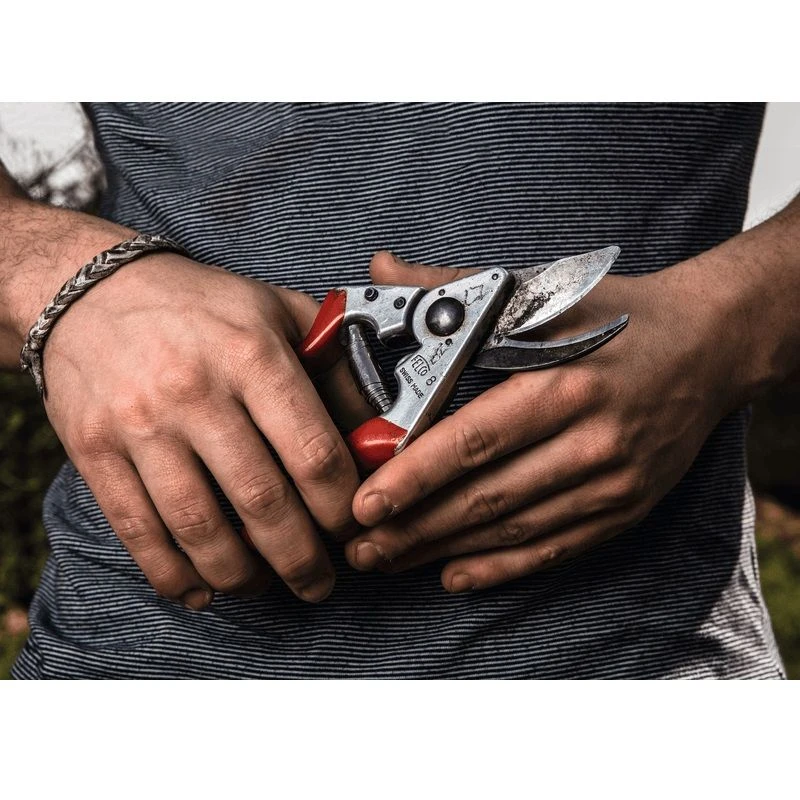 FELCO 8 heeft comfortabele, lichte en stevige handgrepen van gesmeed aluminium. FELCO 8 heeft een gehoekt bovenmes en ondermes vervaardigd van hoogwaardig verhard staal. De snoeischaar is voorzien van een draadsnijder en sapgoot. FELCO 8 is voor de veelgebruiker en voorzien van stootrubbers en de herkenbare rode antislip-bekleding ter bevordering van de ergonomie. Een ideale snoeischaar voor alledaags gebruik in tuin, gaard en park. FELCO 8 voor diverse snoeiwerkzaamheden. Deze snoeischaar is voor rechtshandig gebruik. Alle onderdelen kunnen vervangen worden.Â