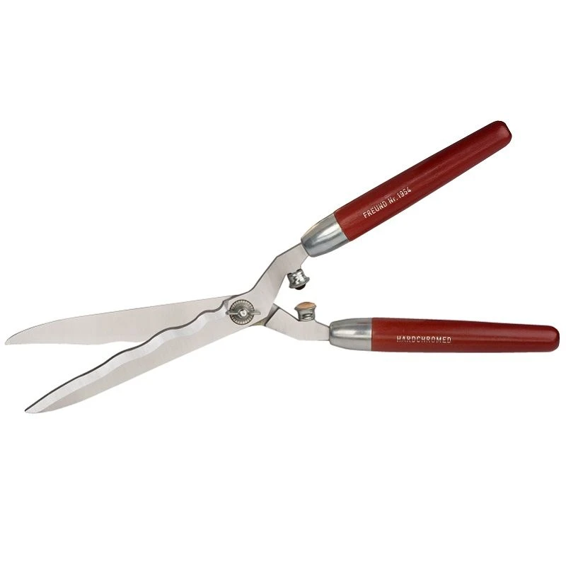 De Freund heggenschaar 1954 heeft roodgelakte houten handgrepen die zorgen voor een perfecte balans tijdens het snoeien van de heg.