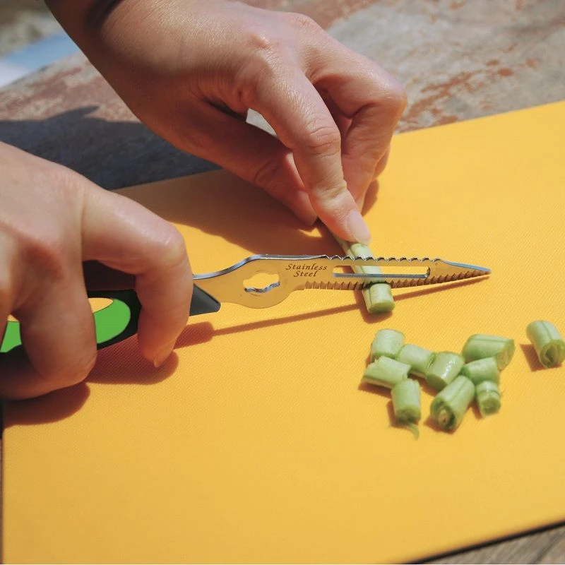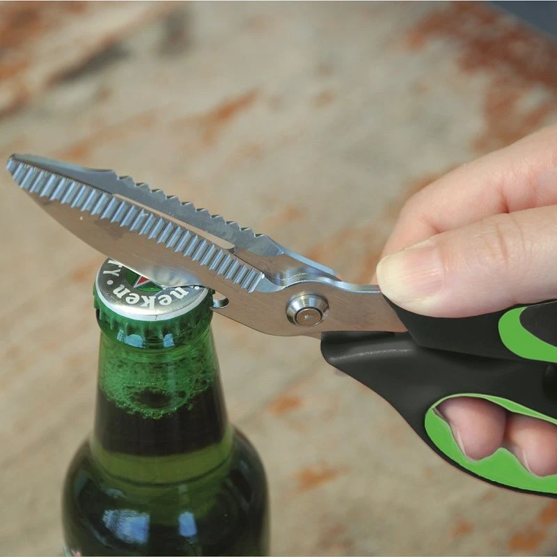 Maar ook voor het schillen van fruit en of groente. Deze handige schaar heeft ook nog een geïntegreerde flesopener.