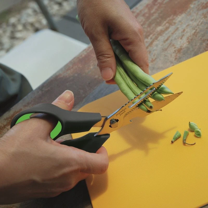 Een 4 in 1 schaar die ideaal is voor huishoudelijk gebruik in de keuken, voor in de (moes)tuin-, voor hobby- en handwerk, of op de camping.