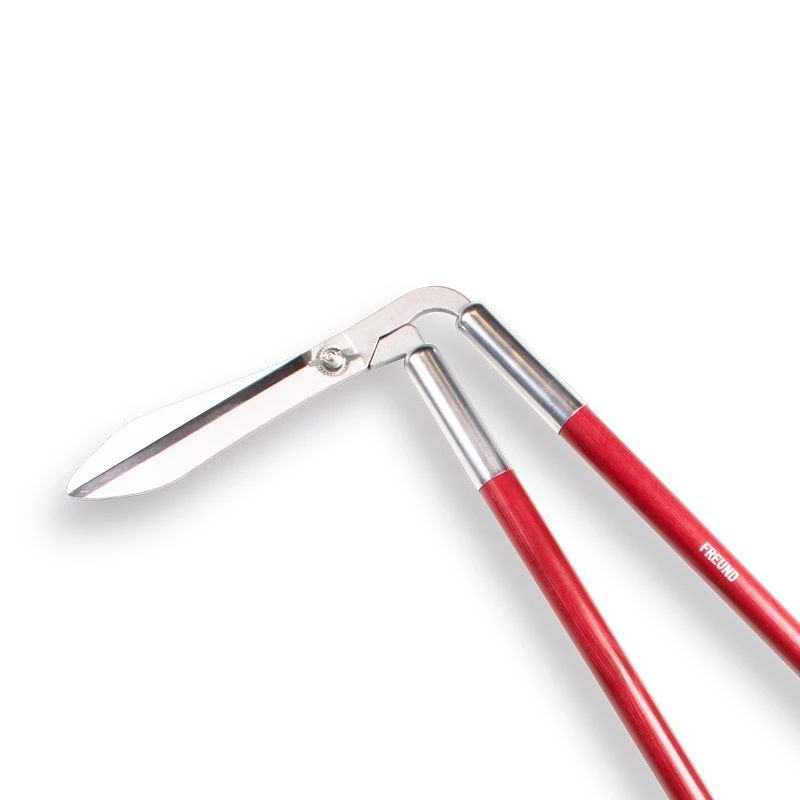 Met gesmede lange hardverchroomde messen. Verticaal snijdend. Lange houten grepen.