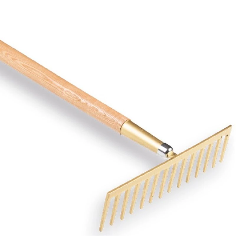 Een complete asfalthark / tuinhark 14-tands recht met dul en een gelakte houten steel 170 cm. Voor het loswoelen van de bovenlaag van de tuingrond en voor het zaaiklaar maken van de border.