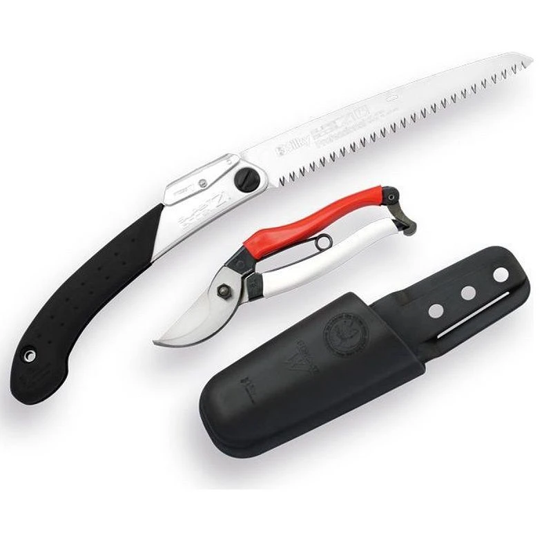 Een handige snoeiset van Silky. Hierbij heeft u alle snoeigereedschap ineen. De Silky Okatsune 103 snoeischaar. Vlijmscherp met altijd een zuivere snede. De Super Accel 21, een ultralicht en inklapbare snoeizaag in een handig etui, de Silky Gomcase W double, een extra groot holster.