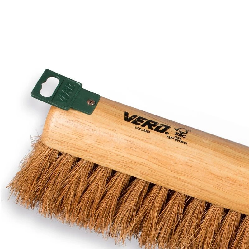 Deze VERO 1550 zaalveger is FSC® gecertificeerd. Een houten veger met ronde kap, blank gelakt. Met zachte kokos natuurvezels, voor het verwijderen van droog fijn vuil op gladde oppervlakken zoals tegels en betonvloeren.